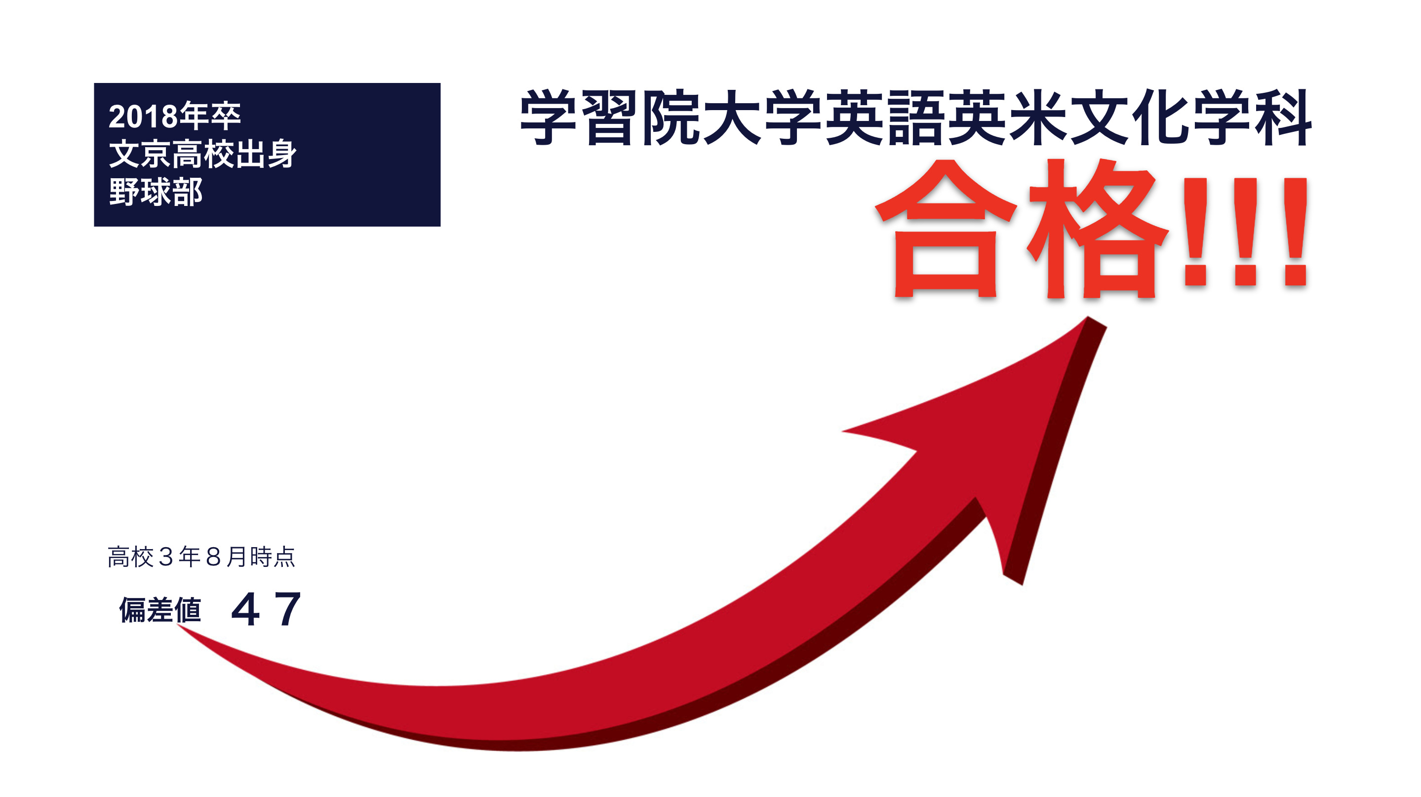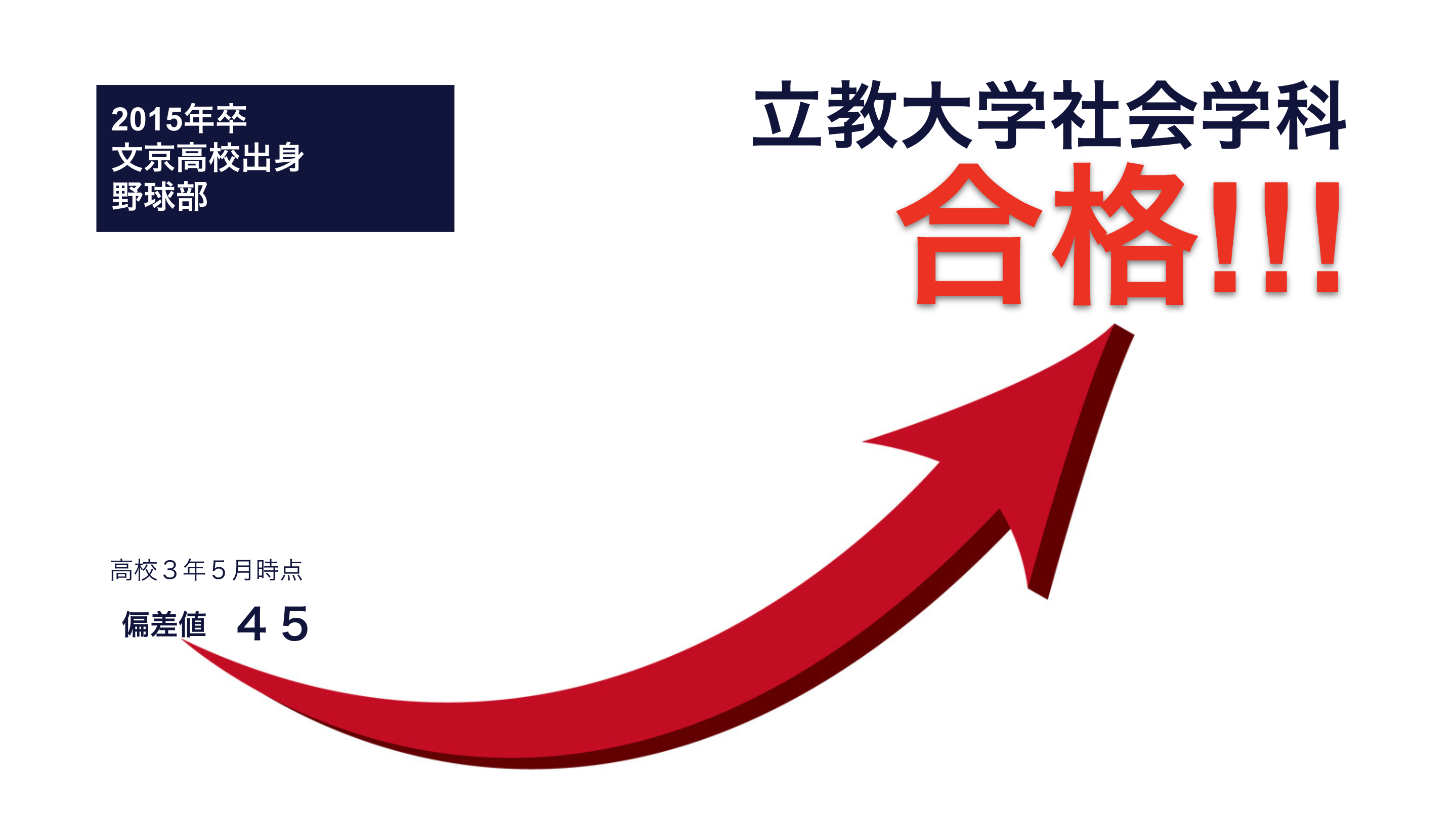 文京高校野球部主将であり、引退後の8月に入塾。 当初は体育教師を目指していたが、周囲を見返すために、一般受験の滑り止め無しで学習院と立教のみ受験。 センターリサーチA判定の東洋大学情報連携学部にまさかの不合格、「先生、連携してませんでした(笑)」との名言を残す。 過去問を1年分もやらず、本番漢文0点で学習院文学部英語英米文化学科に合格。